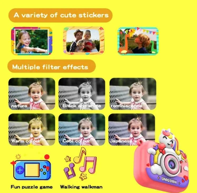 - USB rechargeable kids camera provides long playtime and convenient charging.