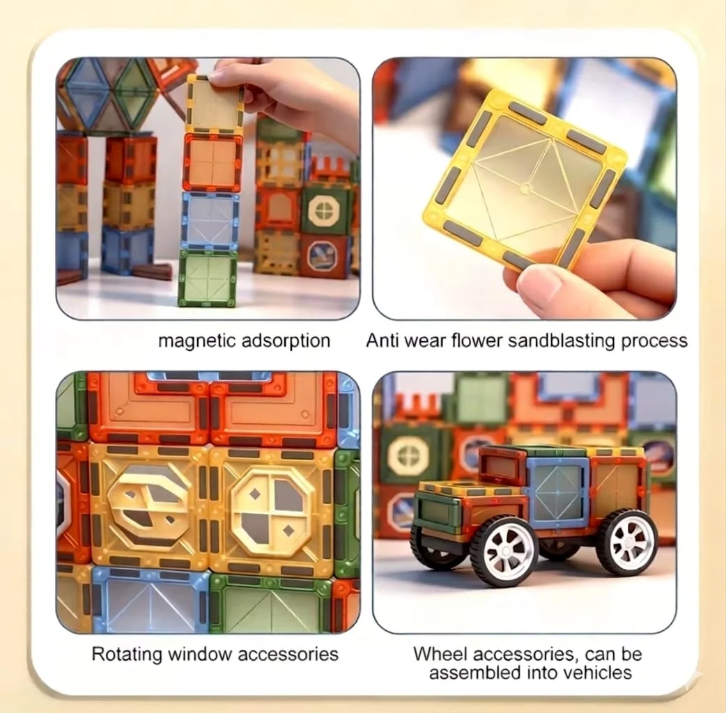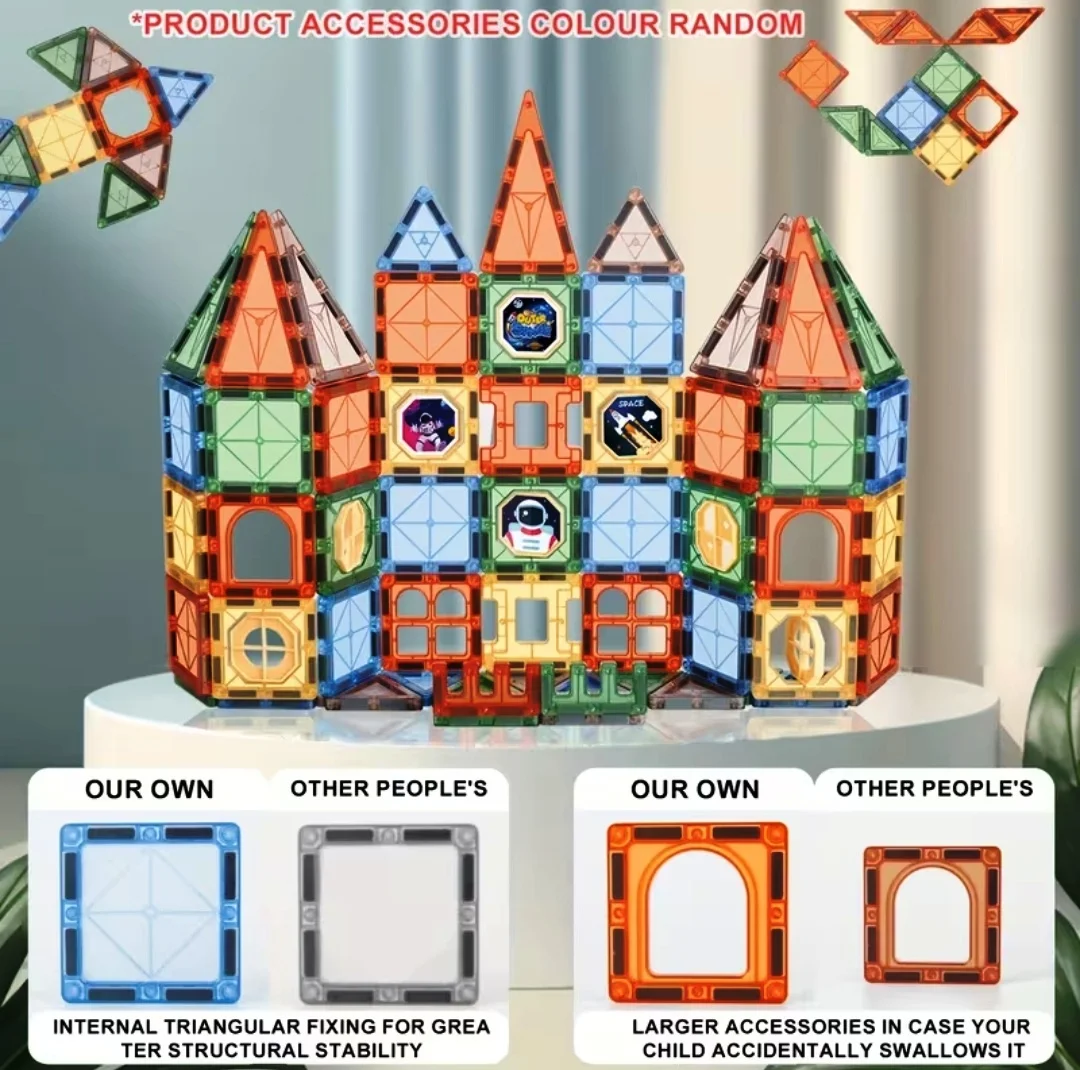 - Ideal for collaborative play, these magnetic tiles inspire teamwork, social interaction, and communication skills. Children can create castles, vehicles, and imaginative worlds together, learning the value of cooperation and joint problem-solving.